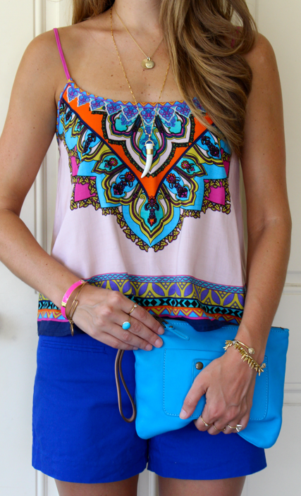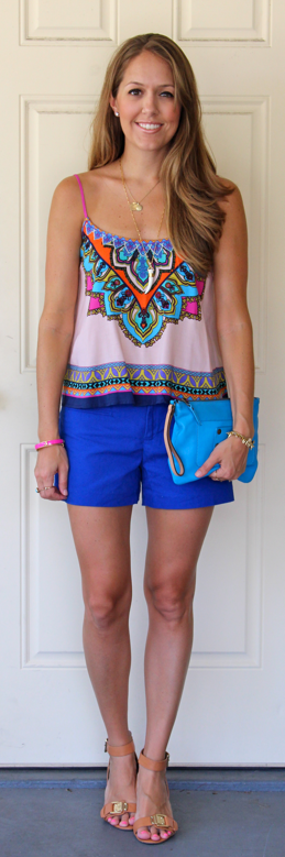 Approx. dates: Shorts are 2 years ago. Shoes and clutch are 1 year ago. Top is new.