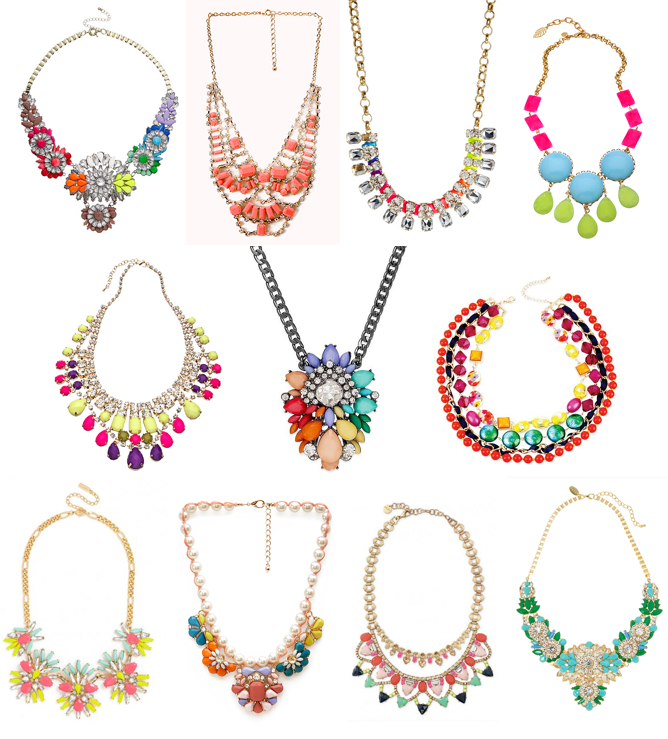Today's loose interpretation of a Jessica Alba outfit includes my favorite statement necklace lately. Why choose one color when you can have the whole rainbow?! I love the way statement necklaces like these look over solid, high neck shirts. More rainbow-y goodness to dress up your basic tops below!