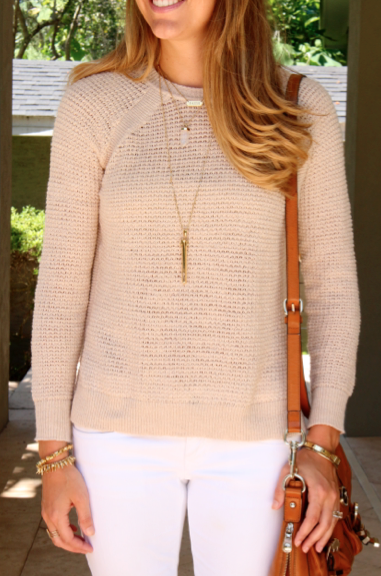 /I stole this outfit idea from a mannequin. I was at J.Crew Factory exchanging a size and saw this waffle knit sweater paired with white jeans. I loved how it looked and thought an olive jacket and Panama hat could be added to the mix, too. I can see this sweater getting tons of use for many years to come!