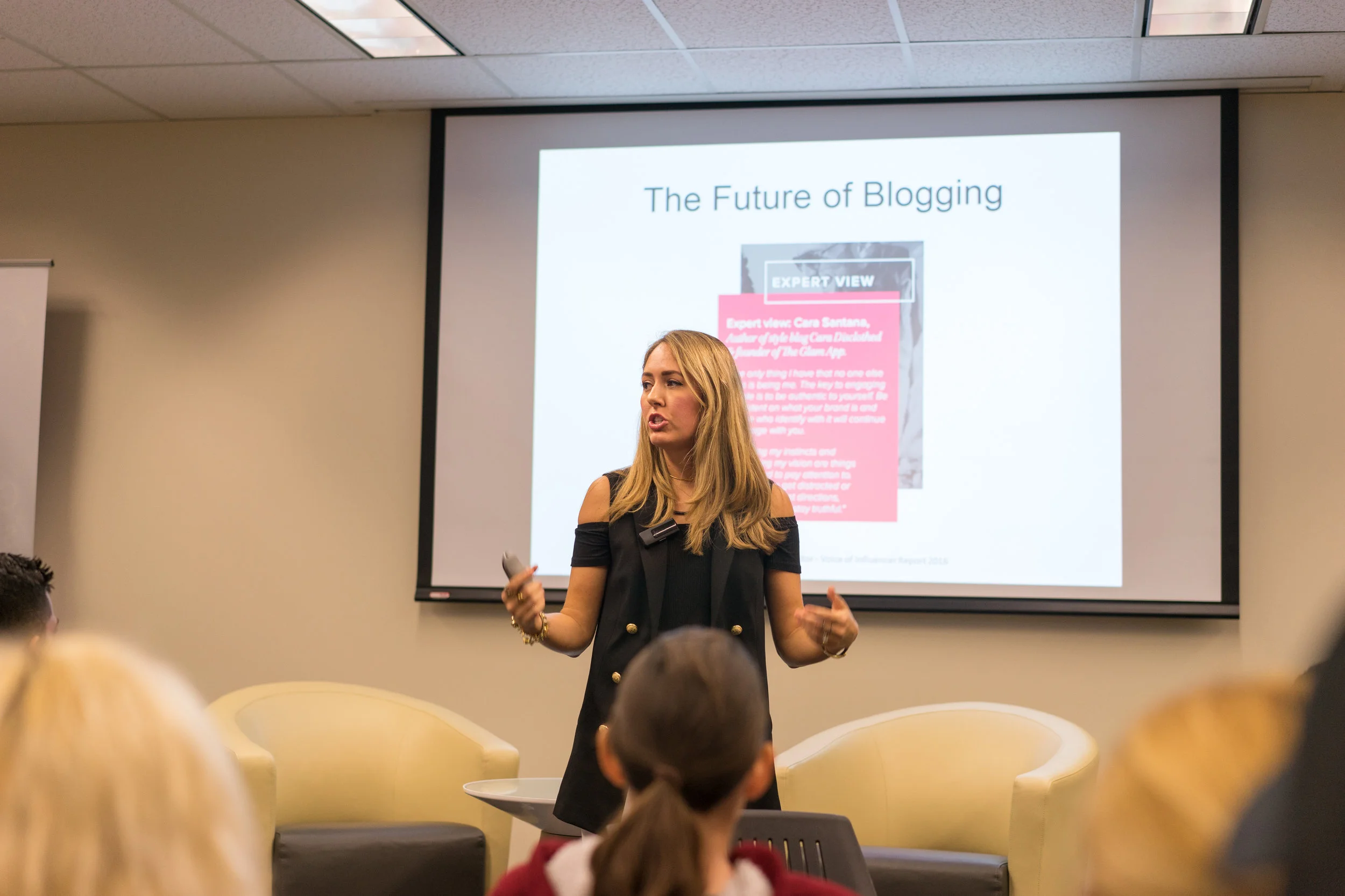 /Today's real-life fashion scenario: a speaking engagement at the University of Central FL! Yesterday I was the guest speaker at The Exchange at the College of Business Administration, as well as the Center for Entrepreneurial Leadership's Blackstone LaunchPad, where I shared my entrepreneurial story and lead a workshop with students (pics below). It was my third time speaking at Blackstone, and my first time at The Exchange. This is what I wore, which we stopped to photograph on the way home. The atmosphere at UCF is pretty laid back so I was going for a combo of dressed up but comfortable, and it fit the bill. I also like the cold shoulder affect you get when you pair a long vest with an off-shoulder top. It's a little style hack that I'll definitely be using to get more mileage out of my long vests!