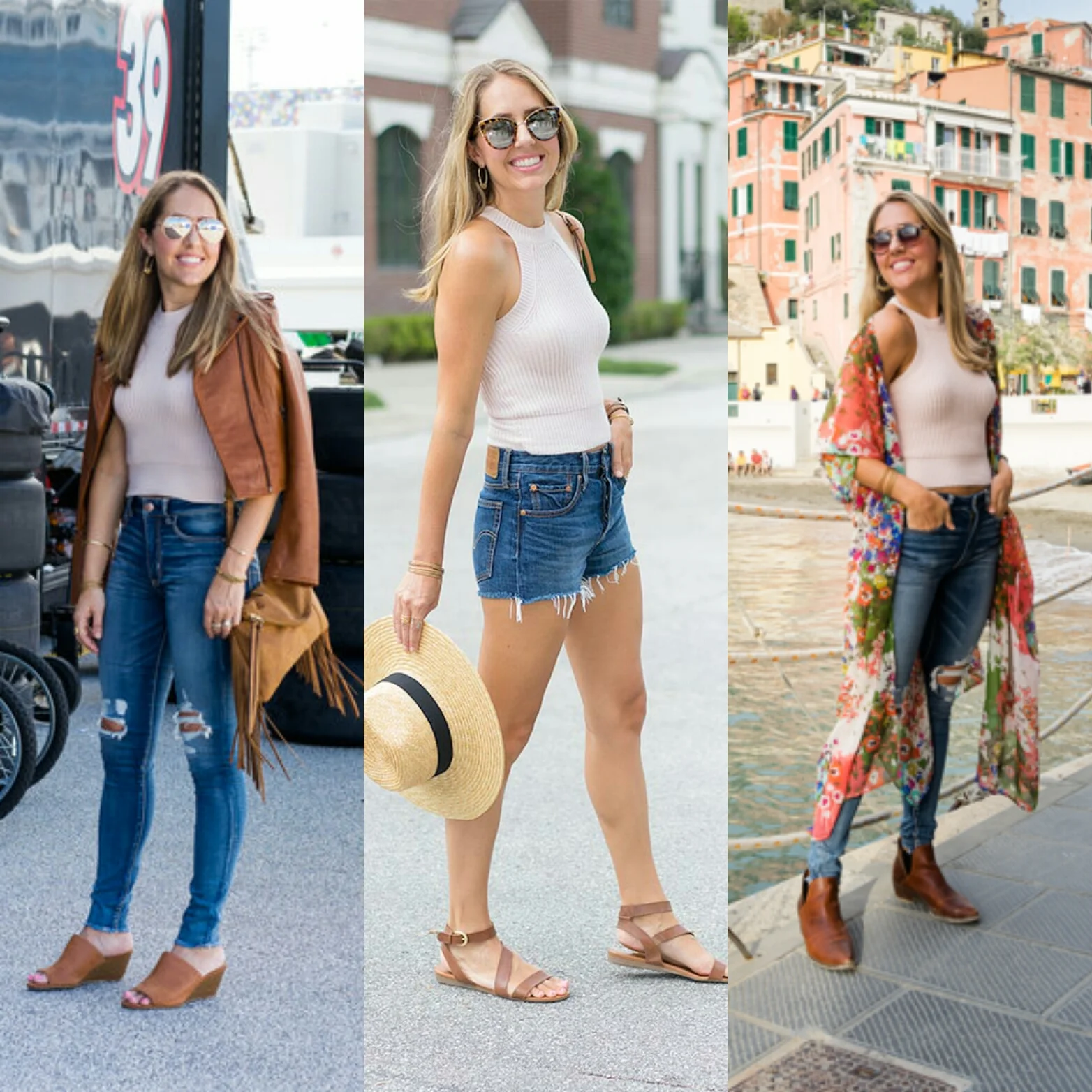 /Over the weekend I was inspired to pair my favorite halter sweater with denim shorts for a simple look. So far I've worn this top with a colorful kimono and ankle boots in Cinque Terre, and with a leather jacket and slides at Nascar. It's been super hot in Orlando lately, so my third look with this top is a better fit for the warmer weather, but arguably still packs just as much panache!