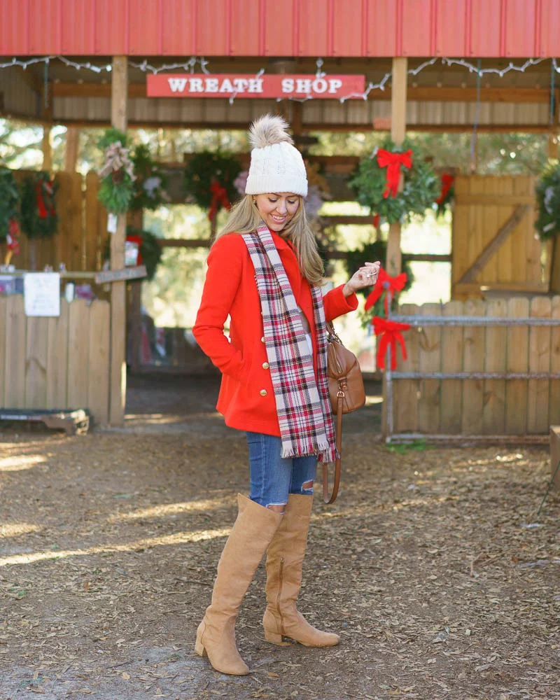 Only a couple weeks until Christmas, and we still didn't have a tree! So we headed up to Santa's Farm in Eustis, FL to pick one out. While were there, we snapped several outfit photos that I'll be sharing over the next few weeks. With temps in the 40-50 degree range, it made for the perfect wintery backdrop (okay... wintery for Florida anyway!!). Today's looks are the same outfit twice - only the coat was switched, from ivory to red. It's crazy how different they look with that one little change, and honestly I'm sharing both because I couldn't decide which one I liked better! The outfit recipe here that I'm taking away: pairing a stripe sweater and a plaid scarf is easy print mixing, and it could work with any color combo. Which coat do you like best with this look?